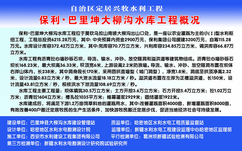 大柳溝水庫(kù)位于新疆維吾爾自治區(qū)巴里坤縣莫?dú)J烏拉山南坡,距哈密市154km。地理位置東經(jīng)93°35.5'-38',北緯43°35'-37'。水庫(kù)距巴里坤縣54.0km,有鄉(xiāng)村公路相通,交通比較便利。工程屬攔河式水庫(kù)。承擔(dān)下游灌溉、人畜用水的任務(wù),同時(shí)兼防洪功能,水庫(kù)控制灌溉面積1.2萬(wàn)畝。水庫(kù)總庫(kù)容372.42萬(wàn)m3,最大壩高36.33m,壩頂長(zhǎng)168.23m。樞紐工程由攔河壩,導(dǎo)流放水洞,溢洪道等建筑物組成。工程規(guī)模屬小(1)型。